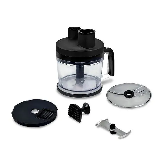 Комплектация блок электродвигателя, насадка-блендер, насадка-венчик, держатель венчика, комплект насадок для чаши, чаша, стакан для смешивания, ось для диска, очиститель насадки, толкатель, антискользящая накладка на днище