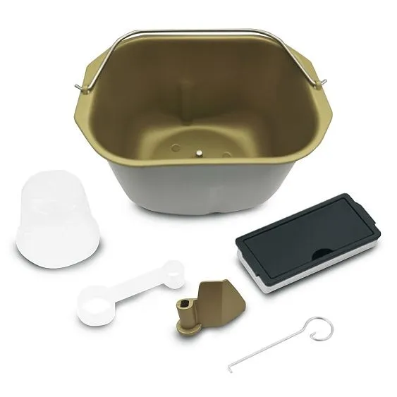 | Комплектация | форма для выпечки с антипригарным покрытием, лопатка, , мерный стакан, мерная ложка, крюк для извлечения лопатки, лопасть для замешивания теста с антипригарным покрытием, съемный контейнер для ингредиентов |