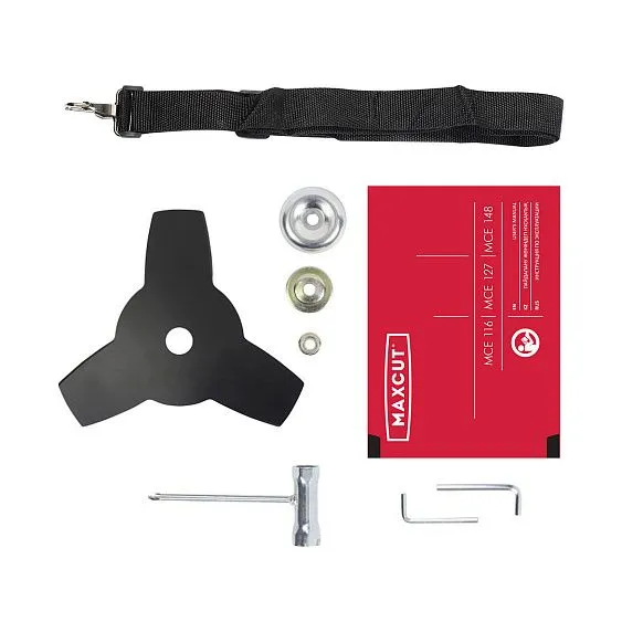 Комплектация | штанга с редуктором, защитный кожух, наплечный ремень, рукоятка, триммерная катушка, нож |