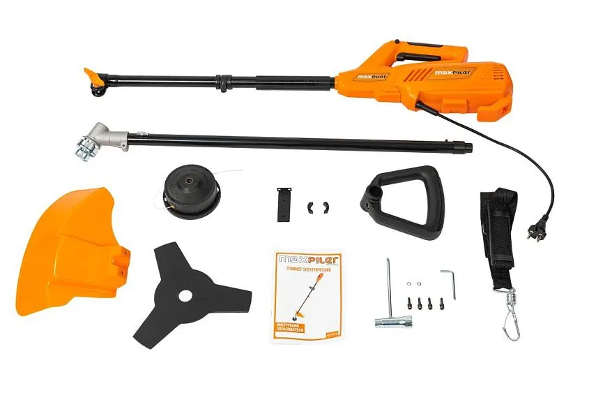 Комплектация | шпуля с леской, диск трехлопастной, D-образная дополнительная рукоятка, кожух защитный, ремень наплечный, набор ключей, набор крепежа |