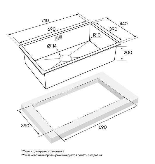 | Комплектация | комплект крепежей для подстольного монтажа, комплект для врезного монтажа, отводная арматура (слив-перелив), сифон бутылочного типа |